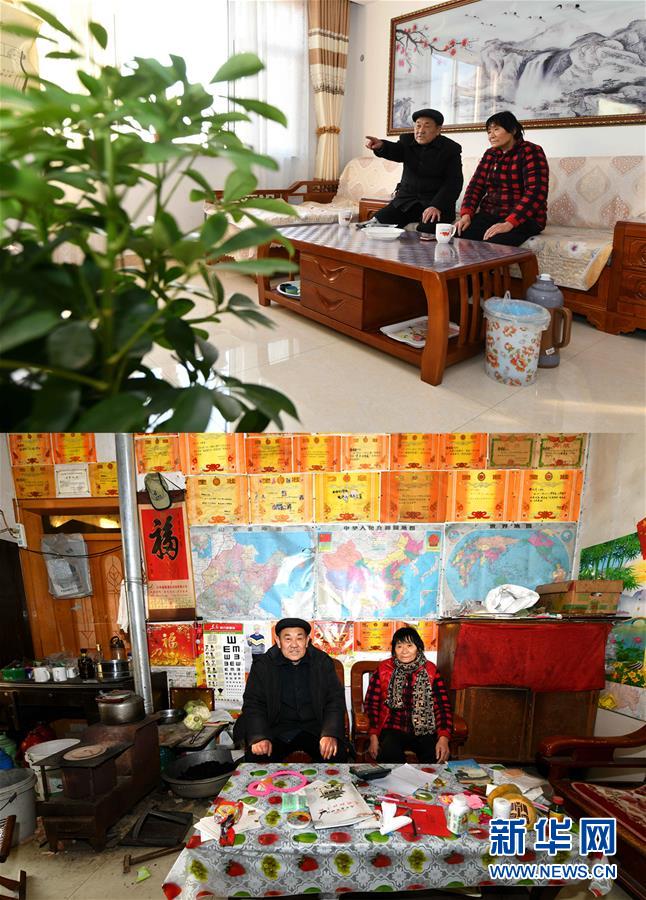 上圖為12月20日拍攝的青城鎮(zhèn)菜園村村民韓貽崗(左)和愛人在青平社區(qū)新居客廳內(nèi);下圖為12月20日拍攝的韓貽崗(左)和愛人在舊居客廳內(nèi)(拼版照片)。  新華社記者 朱崢攝