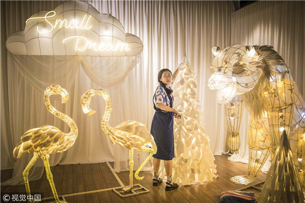 2018年5月6日,廣州,在天河區(qū)一家大商場辦個展時,用紙片做成的北極熊、大松樹、火烈鳥、紙房子在光線的配合下美輪美奐,吸引了很多顧客駐足。“幾乎每個人一看到,都會走進那個夢幻的場景里,和這些紙雕一起合影。”圖片攝于2018年5月6日。南塘/視覺中國