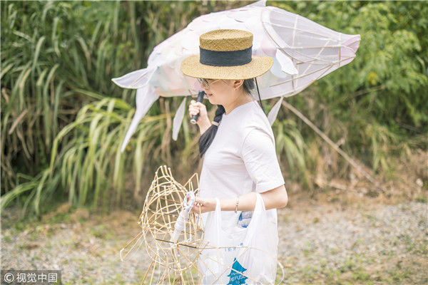 2018年8月10日,廣東揭陽(yáng),溫秋雯把獅子頭扒得只剩下骨架和包布,之后將不同顏色的紙片裁剪成三角形、鱗片形等不同形狀,作為裝飾獅子的皮毛,粘在獅子身上,獅子的鼻子則是用彩紙條以手鞠的方式纏繞而成,在獅頭內(nèi)部安裝了一盞白熾燈,一打開電燈,萌態(tài)可掬的獅子便呈現(xiàn)在人們眼前。紙片的顏色以淡粉、淡綠、淺白色為主,就這樣,人們平時(shí)印象中威猛的南獅,被改裝得萌萌的。圖為2018年8月10日,廣東省梅州市,溫秋雯和她的紙雕作品。