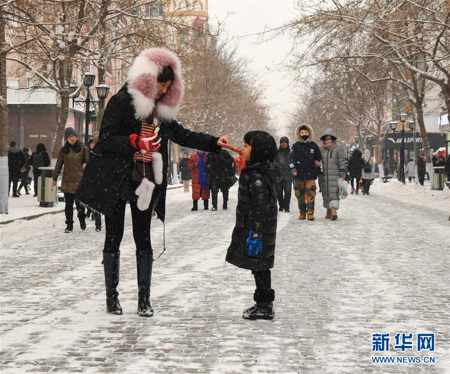 12月21日,游客在哈爾濱中央大街玩耍。當(dāng)日,“冰城”哈爾濱迎來降雪天氣,整個城市變得銀裝素裹。新華社記者韓宇攝