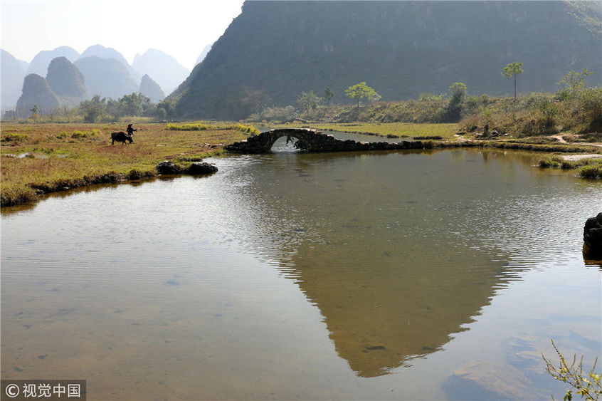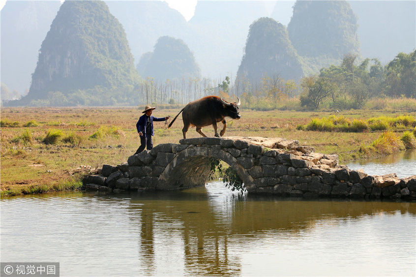 12月17日,在廣西桂林的臨桂區(qū)田心村這座叫做狀元橋的小橋上,剛吃過午飯,老許和他的水牛搭檔又要開始一場生態(tài)演出了。