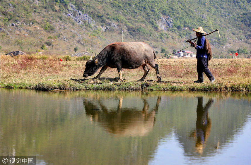 2018年12月17日,廣西桂林。用不到3年時間,農(nóng)民許修保愣是將自己家的水牛訓練得走上了貓步,這讓來自全國各地的游客嘖嘖稱奇:你這么牛,維密天使情何以堪?憑著與水牛的聯(lián)袂演出,一個月下來,老許會有兩三萬的收入進賬,佩服得左鄰右舍紛紛向他伸出了大拇指。棋簿紫/視覺中國