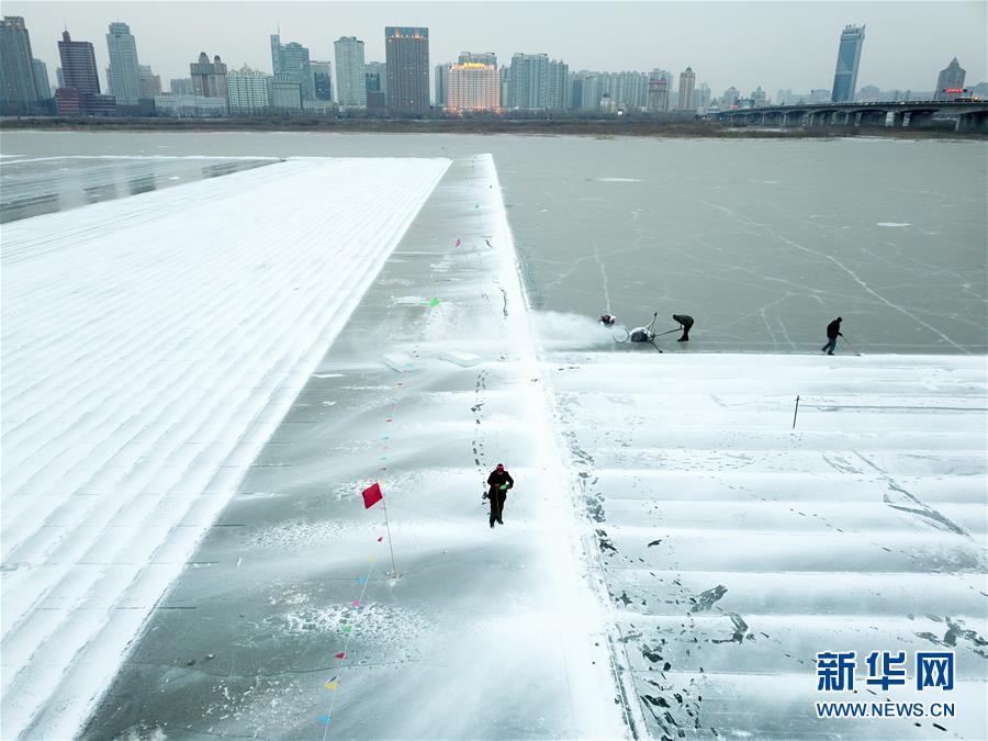 在松花江哈爾濱段江面,工人們?cè)谶M(jìn)行切割和采冰工作(12月12日無(wú)人機(jī)拍攝)。 黑龍江哈爾濱市的冰雪主題樂(lè)園哈爾濱冰雪大世界的采冰和建設(shè)工作近日拉開(kāi)帷幕。為保證足夠的優(yōu)質(zhì)冰供給,每天有近千名采冰人和700多輛運(yùn)冰車(chē)參與到采冰工作。 新華社記者 王松 攝