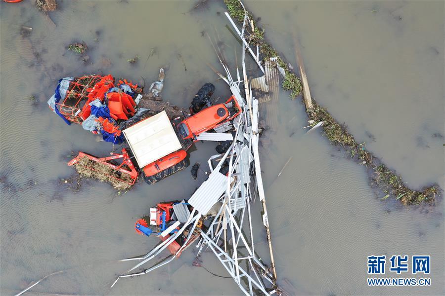 被海浪沖毀的各種汽車或卡在樹間或趴上殘墻。