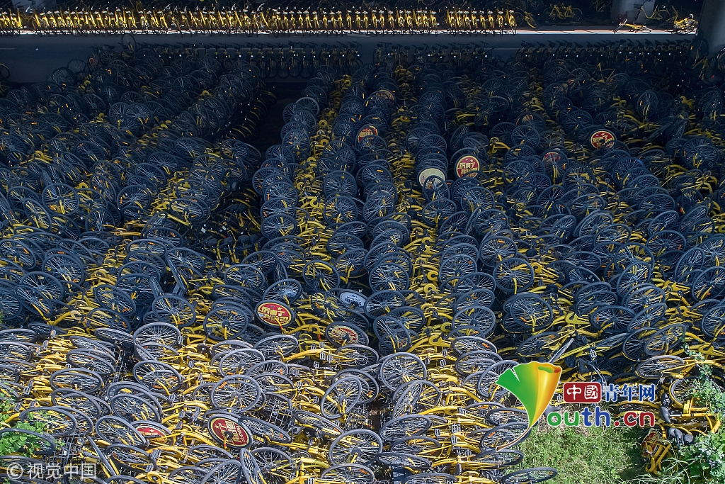 2018年8月24日,西安西咸新區(qū)。連霍高速橋下的ofo小黃車“墳場(chǎng)”。