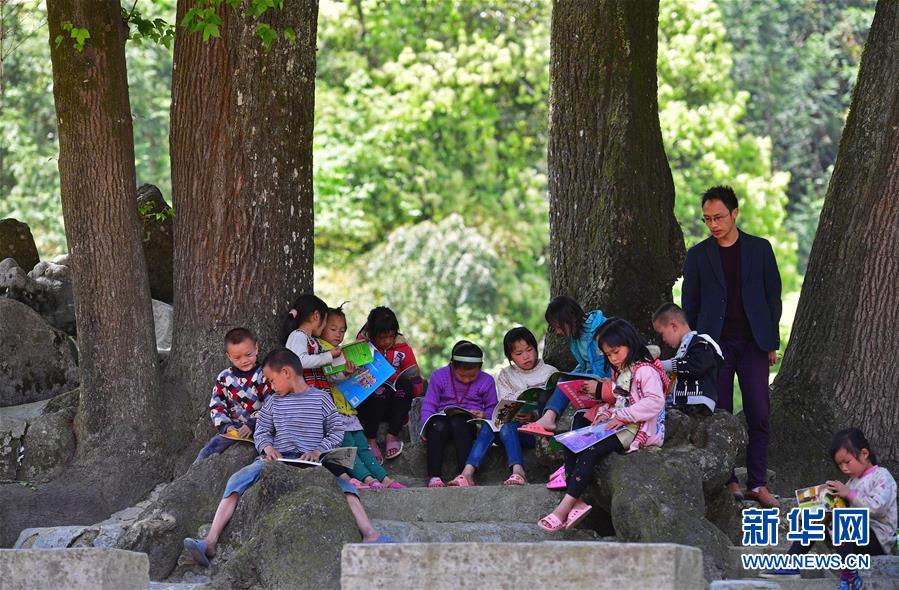烏英教學(xué)點(diǎn)的孩子們在大樹下學(xué)習(xí)(4月17日攝)。