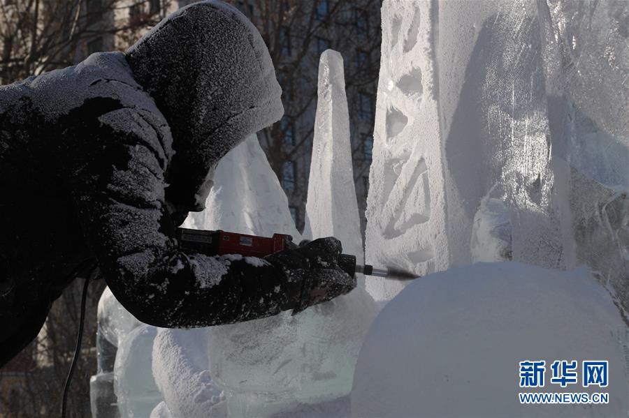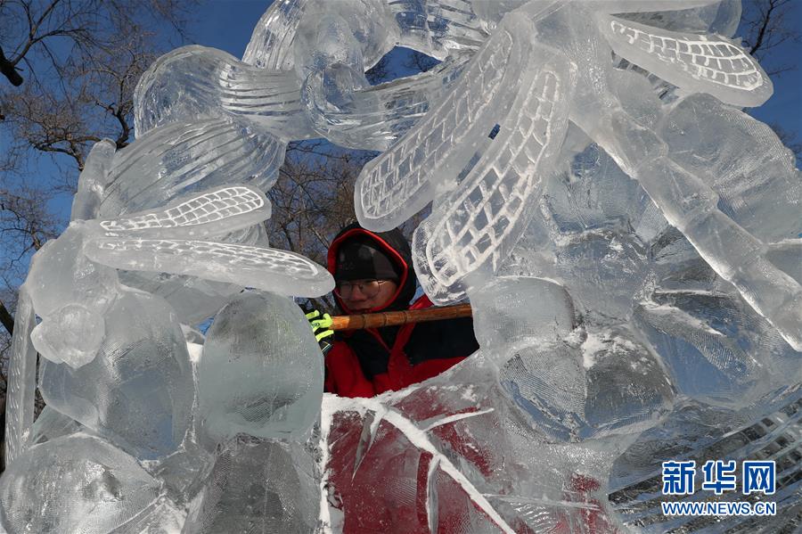 12月27日,選手們?cè)诒荣愔型晟票褡髌贰?當(dāng)日,第十六屆黑龍江省大學(xué)生冰雕藝術(shù)設(shè)計(jì)創(chuàng)作大賽在哈爾濱兆麟公園落下帷幕,全省高校共有99支隊(duì)伍參賽。 新華社記者曹霽陽(yáng)攝