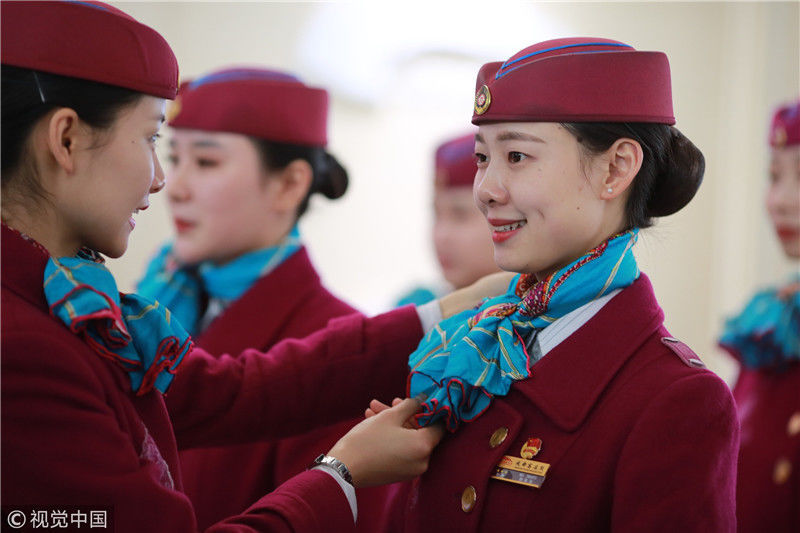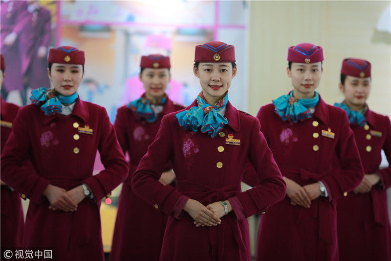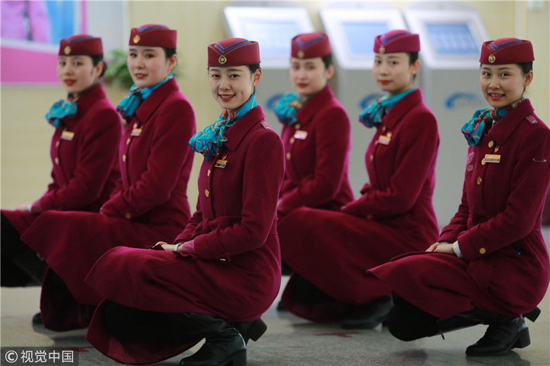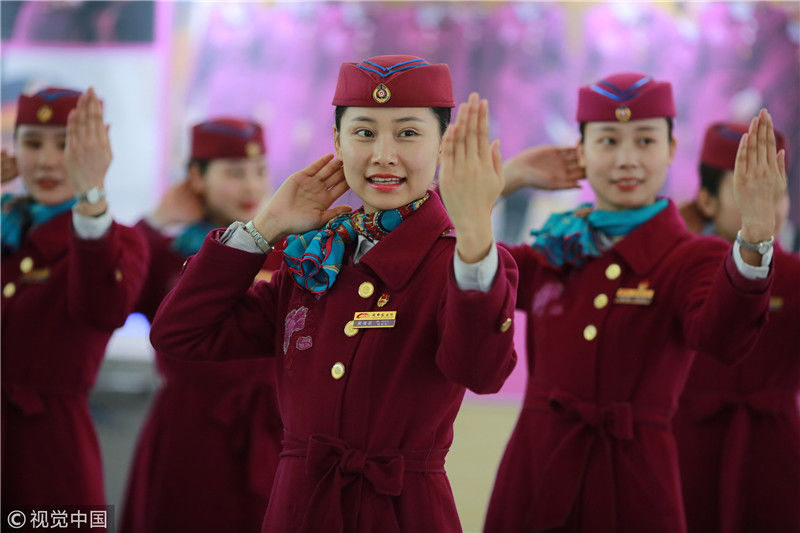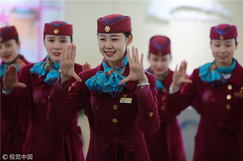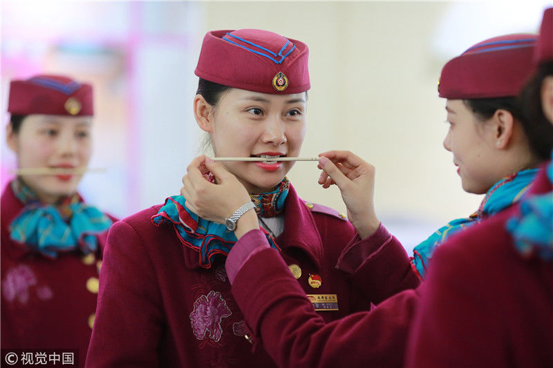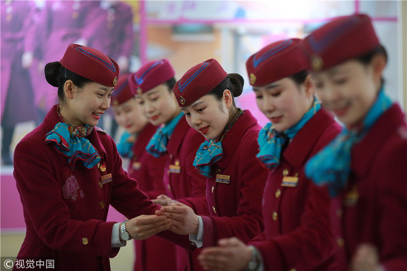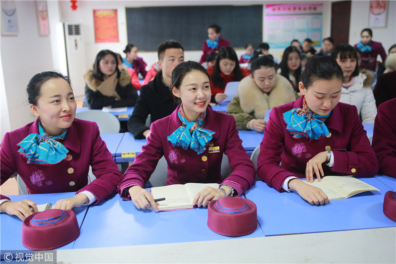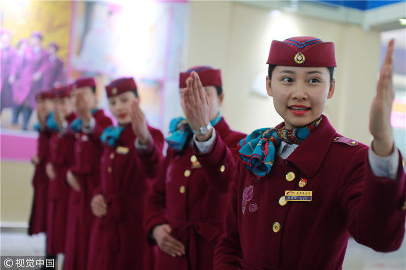 2018年12月27日,四川成都,為備戰(zhàn)即將開通的成雅鐵路,中國鐵路成都局集團(tuán)有限公司成都客運段動車二隊對成雅動車的乘務(wù)人員進(jìn)行理論、形體、服務(wù)禮儀等內(nèi)容的培訓(xùn)。蘇志剛/視覺中國