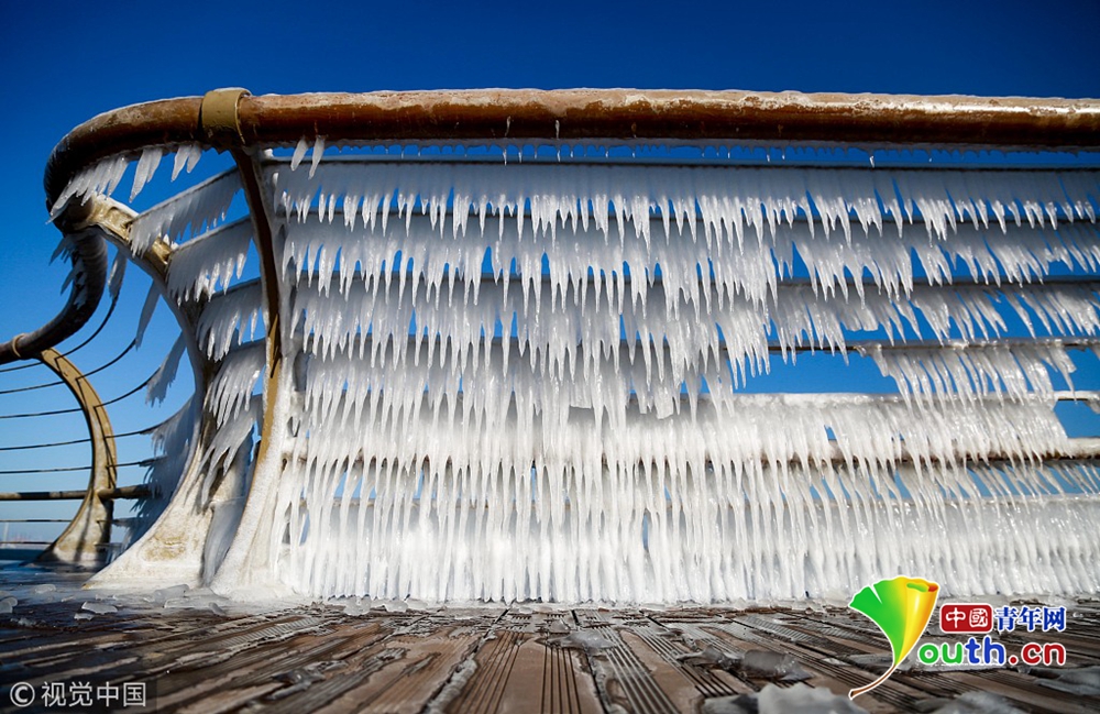 2018年12月29日,大連,晶瑩剔透的冰凌錯落有致的懸掛在東港海岸的木棧道護欄上,美輪美奐,形成了一道“風雕冰琢”的風景。