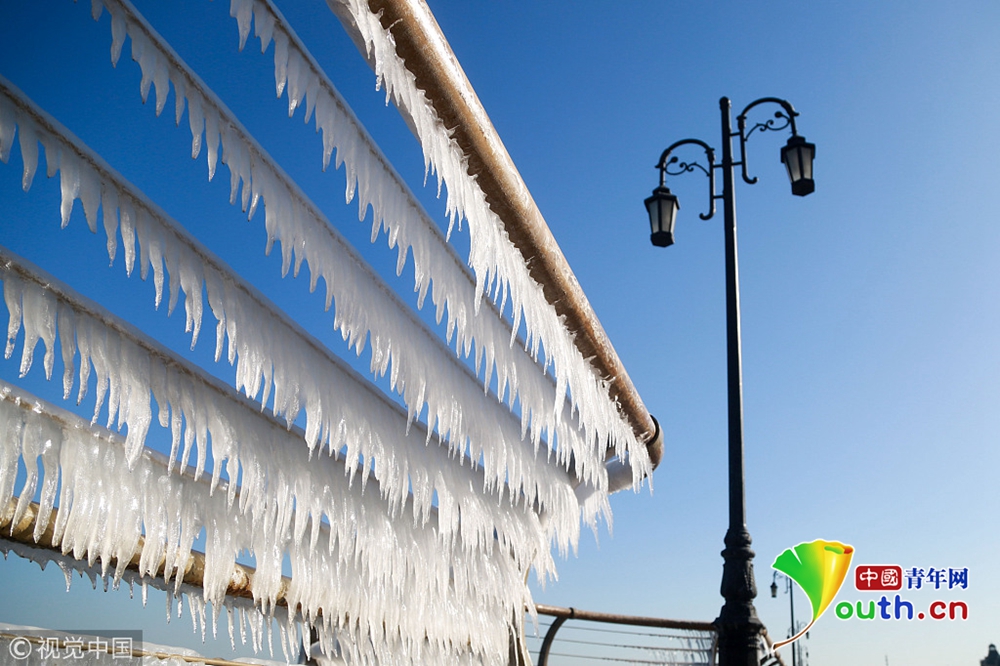 渤海海水在北風的作用下涌向岸邊,在大連東港海岸護欄上凝結(jié)成冰凌,形成約有兩公里的冰凌奇觀。圖為大連市東港海岸護欄結(jié)滿晶瑩剔透的冰棱。圖片來源:視覺中國