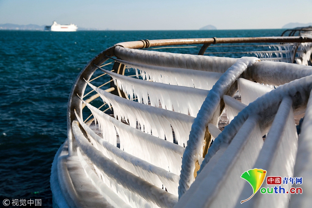 2018年12月29日,大連市迎來入冬以來最冷-12℃的低溫,在大風和潮汐的作用下,海水在岸邊的護欄上瞬間凝固,凝結(jié)并形成大面積形狀各異的冰凌,在延綿5公里的木棧道上形成奇特的冰凌奇觀。