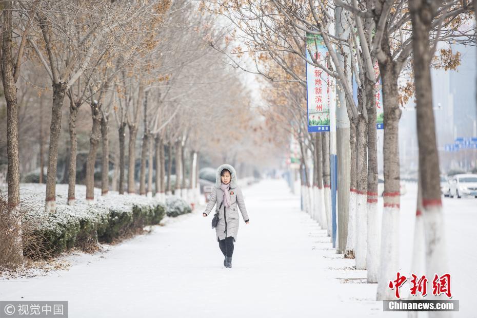山東濱州發(fā)布道路結(jié)冰黃色預(yù)警信號(hào)市區(qū)出現(xiàn)較明顯降雪,路表溫度低于0℃。圖片來源:視覺中國(guó)
