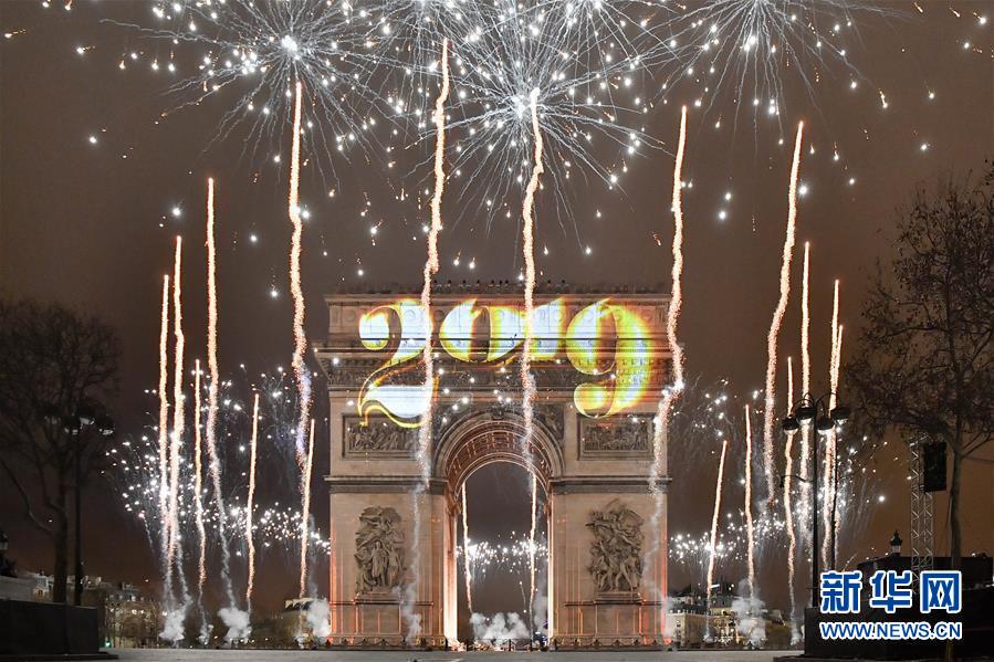 這是1月1日在法國巴黎凱旋門拍攝的燈光秀和煙火。 法國巴黎以在凱旋門打上投影燈光和放煙火的方式迎接新年的到來。 新華社記者陳益宸攝