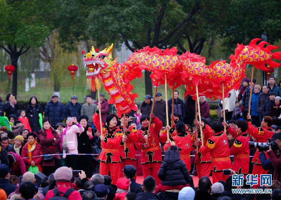 2019年1月1日,演員在展演活動(dòng)上進(jìn)行舞龍表演。2019年元旦,浙江省桐鄉(xiāng)市濮院鎮(zhèn)舉辦新年“非遺文化藝術(shù)節(jié)”活動(dòng),濮院鎮(zhèn)下屬多個(gè)鄉(xiāng)村的傳統(tǒng)美食制作、手工藝品、非遺文化表演等鄉(xiāng)村特色非遺項(xiàng)目在濮院鎮(zhèn)中心廣場進(jìn)行集中展示展演。新華社記者 徐昱 攝