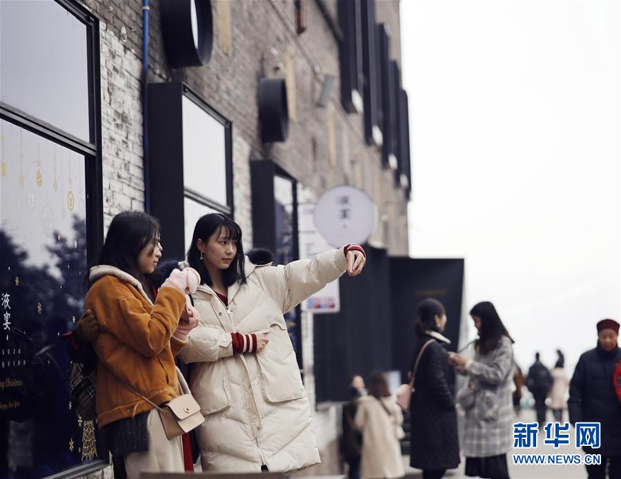 1月1日,游客在重慶鵝嶺二廠文藝街區(qū)內(nèi)的一棟由老廠房改建的文藝咖啡館前自拍。