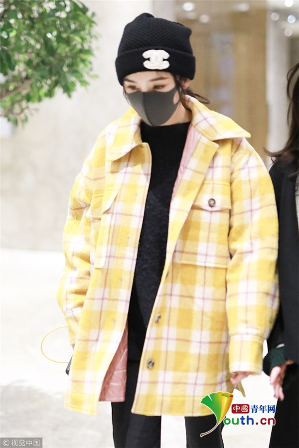 2018年1月6日,上海,楊冪現身某酒店。她戴著帽子口罩,身穿黑色套裝,而外面搭配的奶黃格子外套卻瞬間減齡,明亮又惹眼,無懼寒冬露著纖細腳踝,依舊是那個很會穿搭的大冪冪。