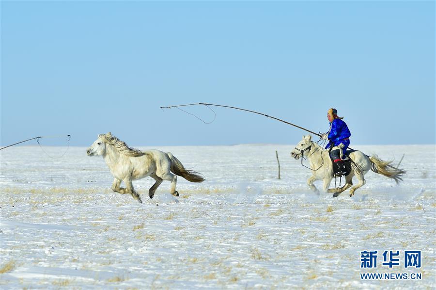 1月8日,牧民進(jìn)行套馬表演。 時(shí)下正值草原冬季旅游旺季,內(nèi)蒙古自治區(qū)西烏珠穆沁旗的牧民們?cè)谘┰弦徽股硎郑瑸橛慰驼宫F(xiàn)獨(dú)特的民族風(fēng)情。 新華社記者 鄒予 攝