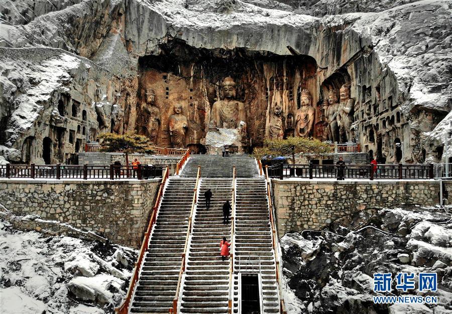 當(dāng)日,雪后的河南洛陽龍門石窟景區(qū)銀裝素裹,一幅天然的水墨畫卷徐徐展開。