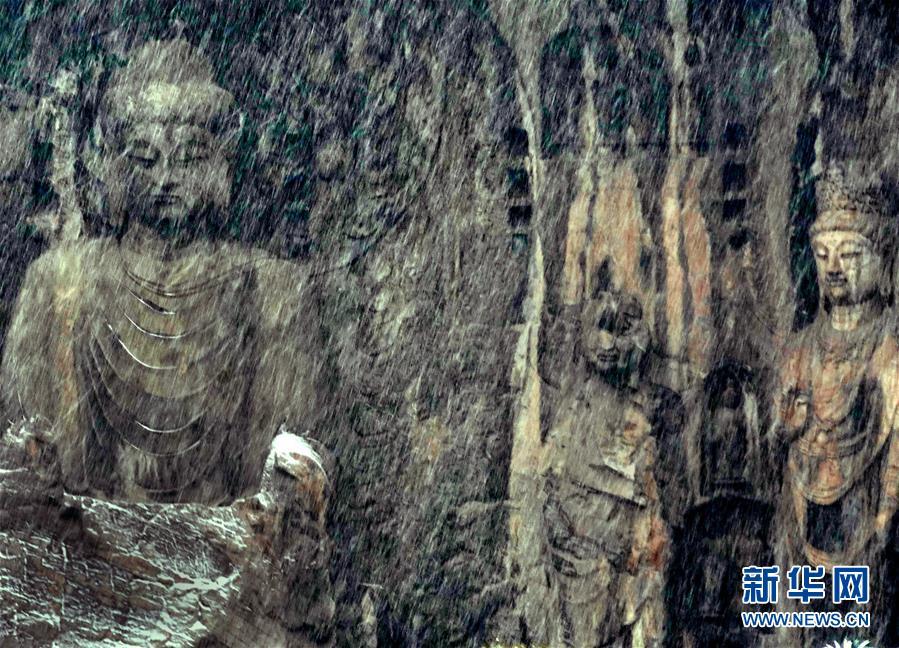 洛陽(yáng)龍門(mén)石窟景區(qū)內(nèi)的盧舍那大佛在雪中若隱若現(xiàn)(1月9日攝)。 新華社記者李安攝