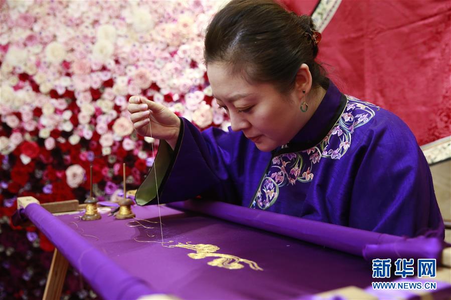 1月12日,在北京“碧泓云想”服裝設(shè)計(jì)工作室,高定服裝設(shè)計(jì)師畢紅在為中式服裝制作刺繡紋樣。畢紅設(shè)計(jì)的中式服裝以棉、麻、真絲等面料為主。春節(jié)來(lái)臨,其團(tuán)隊(duì)加班加點(diǎn)為顧客趕制中式服裝。