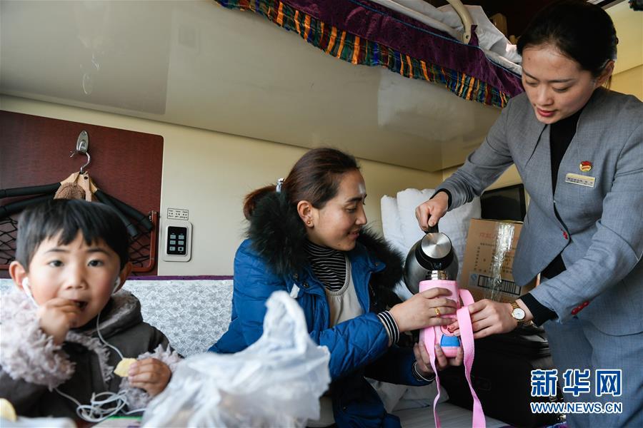 大學(xué)生剛措(右)和桑旦措姆(中)放寒假乘坐Z6802次列車回老家那曲(1月11日攝)。