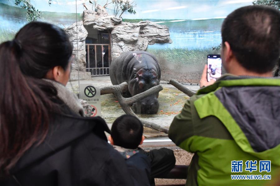 1月13日,游客在北京動物園恒溫的河馬館內觀賞河馬。
