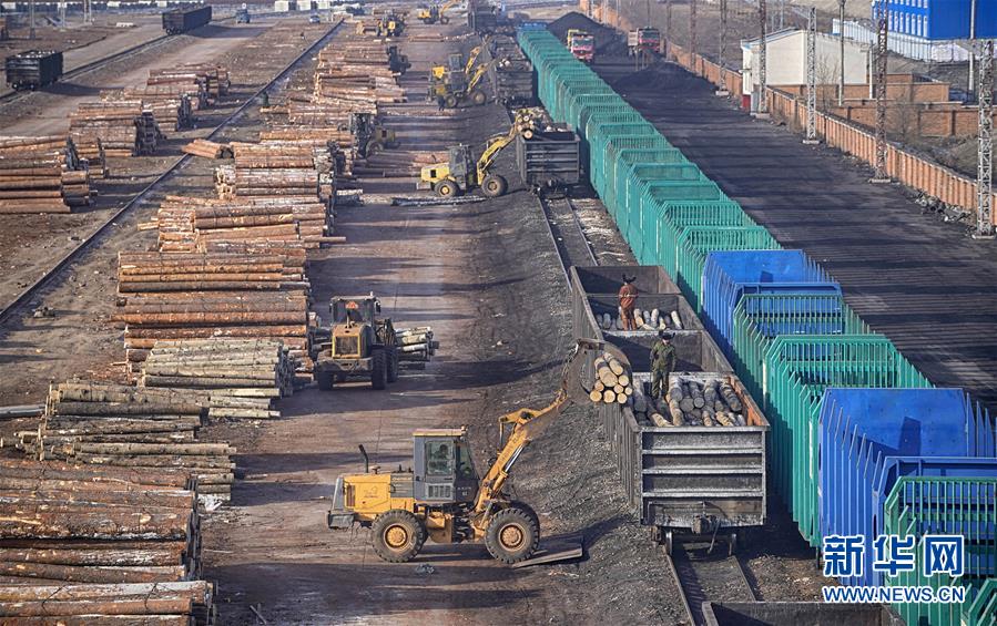 1月12日,在滿洲里鐵路口岸站裝卸二車間原木換裝場(chǎng)區(qū),工作人員進(jìn)行原木裝車作業(yè)。 新華社記者 才揚(yáng) 攝