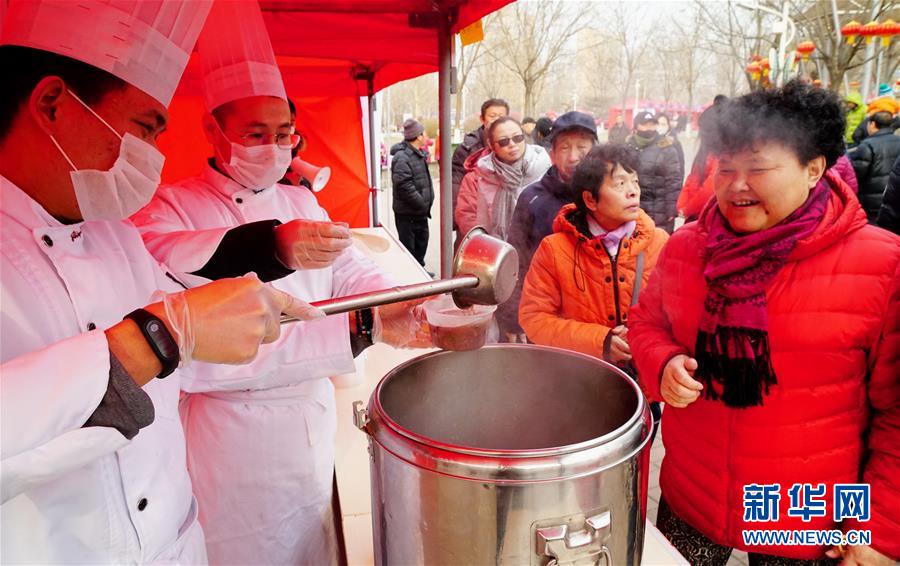 1月12日,人們在年貨大集上排隊品嘗臘八粥。