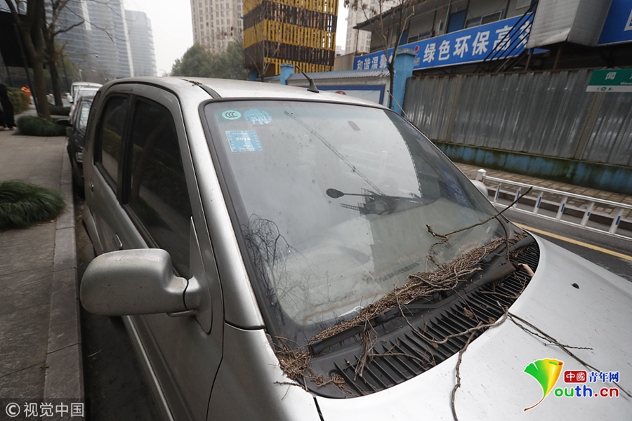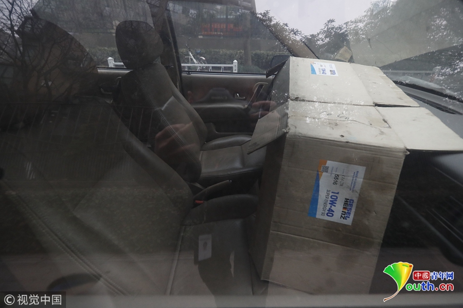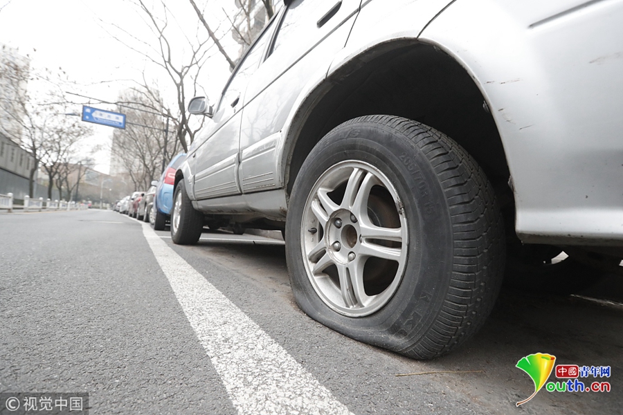 因為是免費(fèi)停車位,就成為僵尸車的天堂。粗粗?jǐn)?shù)了一遍,至少有10余輛汽車裹著車衣,被落葉等臟物覆蓋;有的車最后的年檢標(biāo)志是3年前,車胎漏氣,車內(nèi)也是堆著雜物。