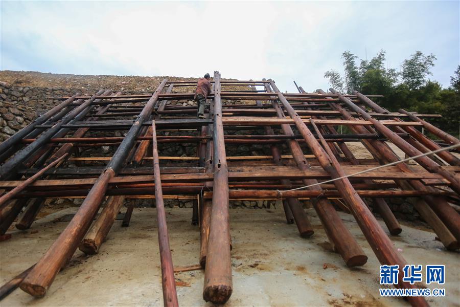 1月15日,在廣西融水苗族自治縣融水鎮(zhèn)夢(mèng)嗚苗寨,一名工人將苗族吊腳樓的主要結(jié)構(gòu)進(jìn)行“復(fù)原”安裝。新華社記者 陳君清 攝