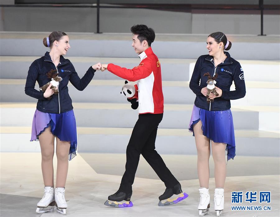 1月15日,中國花樣滑冰選手金博洋(中)與芬蘭運動員交流。 當(dāng)日,“2019中芬冬季運動年”開幕式在北京首鋼冰球館舉行。 新華社記者申宏攝