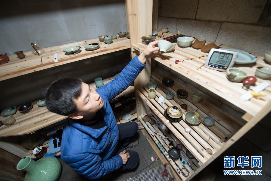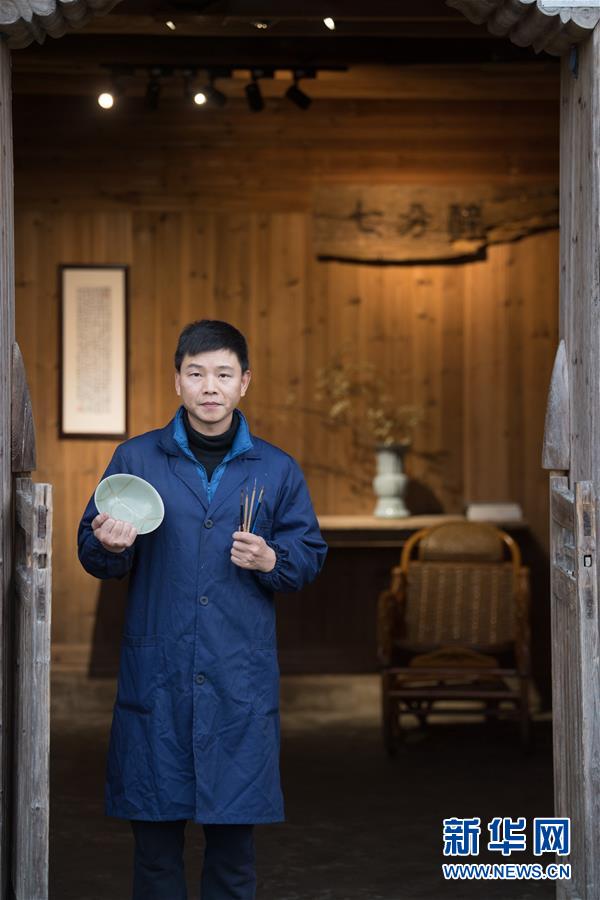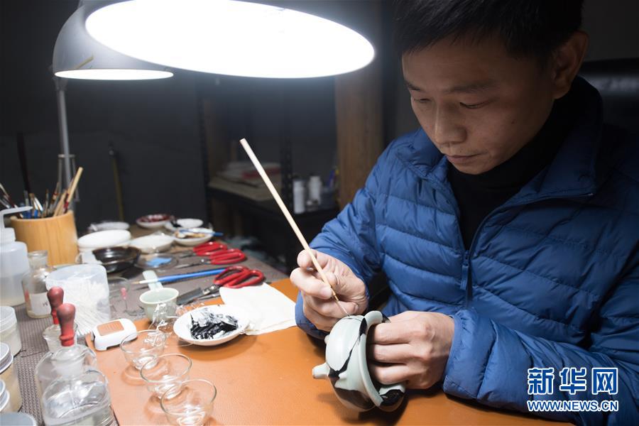 1月15日,吳榮強在龍泉市牛頭嶺村“七分醉”工作室對一件青瓷器皿進(jìn)行漆繕。 新華社記者翁忻旸攝