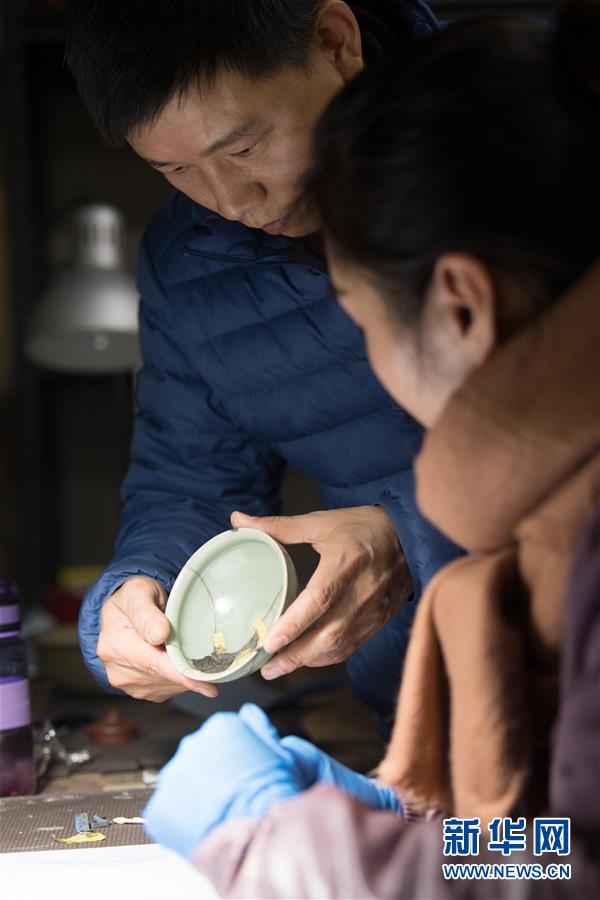 1月15日,龍泉青瓷藝術(shù)家楊盛侃(右)將一件有瑕疵的作品帶到吳榮強的工作室,跟他討論漆繕修復(fù)的細(xì)節(jié)。 新華社記者翁忻旸攝