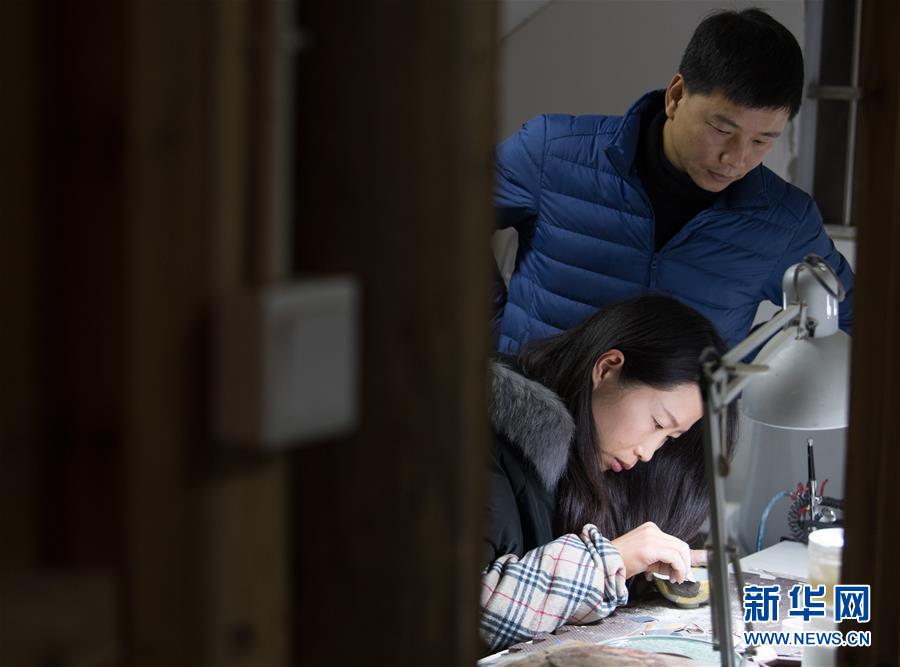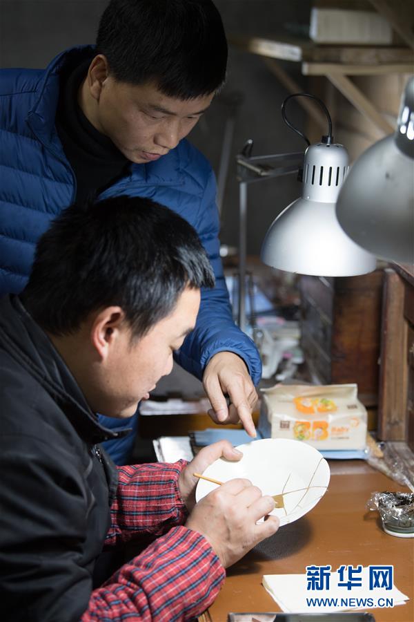 1月15日,在龍泉市牛頭嶺村“七分醉”工作室,吳榮強(上)指導(dǎo)一名徒弟進(jìn)行漆繕。 新華社記者翁忻旸攝