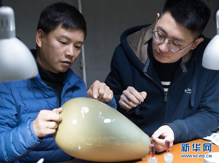 1月15日,吳榮強(右)和徒弟在龍泉市牛頭嶺村“七分醉”工作室曬漆。 新華社記者翁忻旸攝