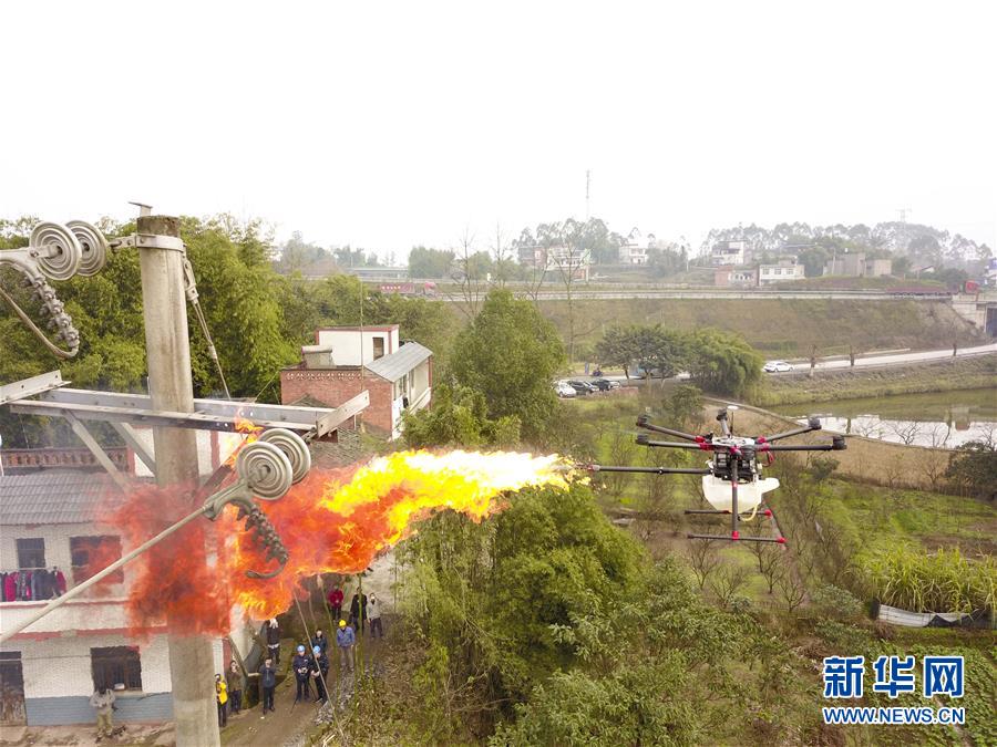 1月16日,噴火清障無人機在國網(wǎng)重慶永川供電公司無人機班操作手的控制下,對重慶市永川區(qū)大安街道小坎村10千伏隆安線16號桿處的一個馬蜂窩進行噴火清除(無人機航拍)。 1月16日,經(jīng)過3年多的研發(fā)和測試,重慶首臺噴火清障無人機在國網(wǎng)重慶永川供電公司無人機班正式投用。這臺多旋翼無人機,通過搭載帶有燃料箱、油泵、自動點火裝置的噴火吊艙任務(wù)模塊,可以對影響高空電力線路安全的飄掛物進行定點障礙清除作業(yè)。 據(jù)噴火清障無人機研發(fā)負責人何濤介紹,過去高空清除異物主要靠人工進行,為保證安全經(jīng)常需要停電作業(yè),因此他們結(jié)合實際工作經(jīng)驗和高空電力線路的自身特點,設(shè)計和制造出了噴火清障無人機。2018年測試期間,國網(wǎng)重慶永川供電公司無人機班在多種環(huán)境下成功執(zhí)行了50多次高空電力線路清障作業(yè)。 新華社記者 劉潺 攝