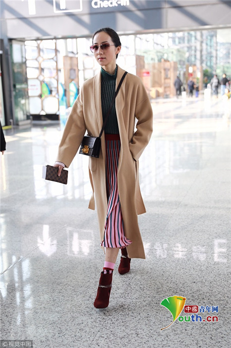 2019年1月17日,上海,韓雪現(xiàn)身機場,穿著條紋紗裙露出小腿,十分抗凍,她搭配經(jīng)典的駝色大衣,氣質出眾在機場人群中相當搶鏡。
