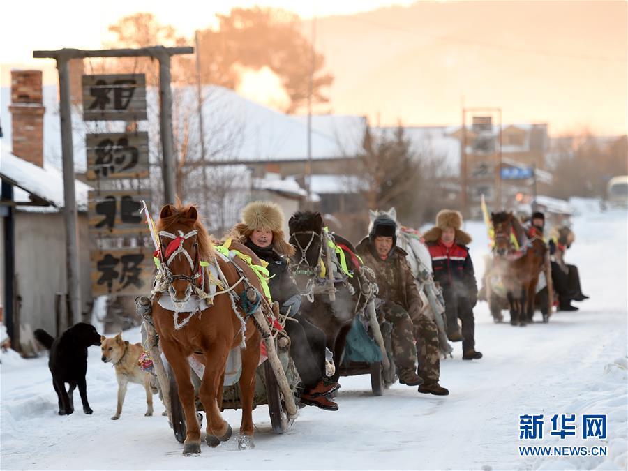 1月25日,在黑龍江省漠河市北極村,馬爬犁載著游客去神州北極廣場“找北”。