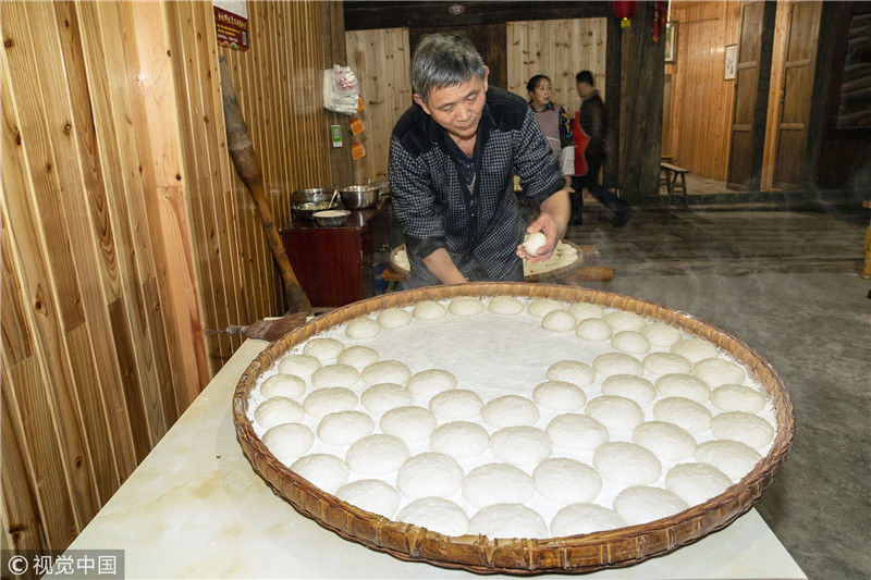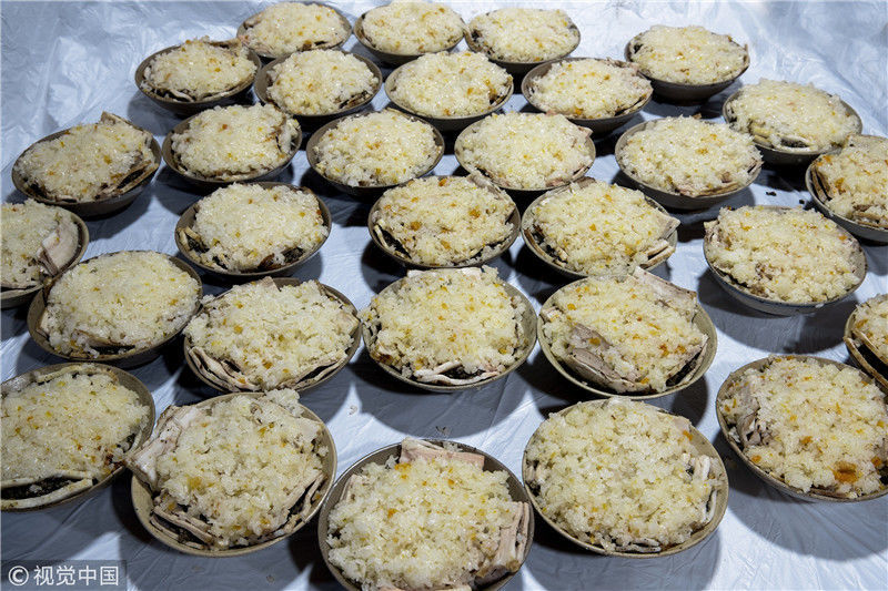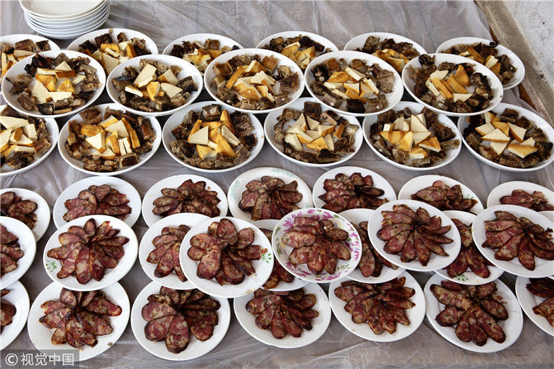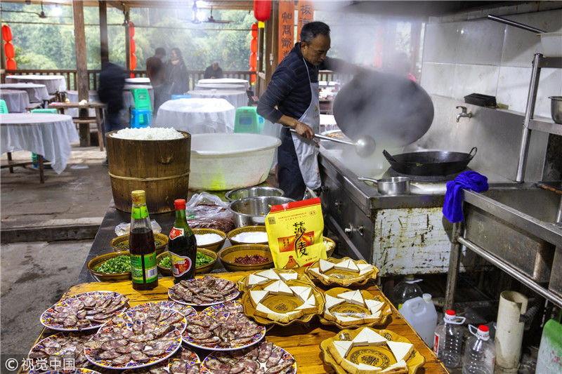 2019年1月26日,重慶中山古鎮(zhèn),880桌“千米長宴”5萬人共品年味。街坊們在頭天就開始準備各種菜肴與小吃。