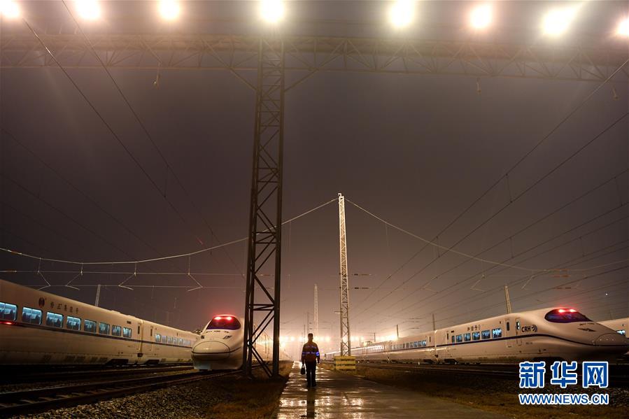 1月29日,王瑞在合肥南動(dòng)車(chē)運(yùn)用所進(jìn)行動(dòng)車(chē)組連掛作業(yè)。新華社記者劉軍喜攝
