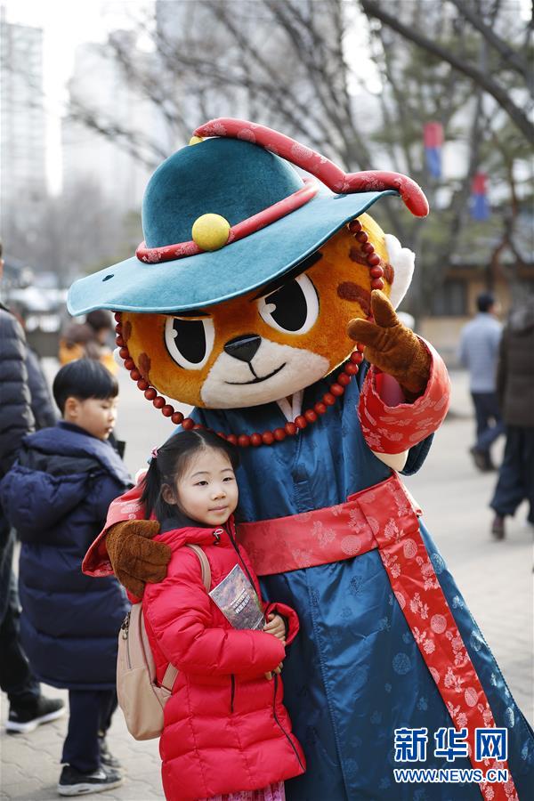 2月5日,在韓國京畿道龍仁市的韓國民俗村,一名中國小朋友和工作人員扮成的玩偶合影。 雖然中國人過春節(jié)的傳統(tǒng)是返鄉(xiāng)回家,但越來越多的國人選擇在春節(jié)期間走出國門,利用春節(jié)假期外出旅游。 新華社記者 王婧嬙 攝