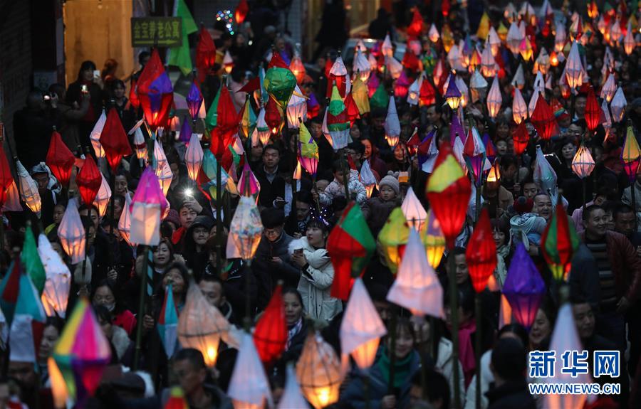 2月18日,在四川省南充市嘉陵區(qū)金寶鎮(zhèn),群眾舉著“蠐蟆燈”巡游。 當(dāng)日是農(nóng)歷正月十四,夜幕降臨后,川渝等地?cái)?shù)萬名群眾在四川省南充市嘉陵區(qū)金寶鎮(zhèn)匯聚,點(diǎn)亮“蠐蟆燈”,敲著鑼鼓唱著歌謠,將“蠐蟆”送到幾公里外的田邊或者河邊燒掉,祈福健康平安。星星點(diǎn)點(diǎn)的燈光在鄉(xiāng)間小路閃爍移動(dòng),場(chǎng)面壯觀熱烈。 “送蠐蟆”祈福這一習(xí)俗源于清朝,歷經(jīng)演變成為川東北地區(qū)一個(gè)古老而神秘的地方民俗節(jié)日。 新華社記者 江宏景 攝