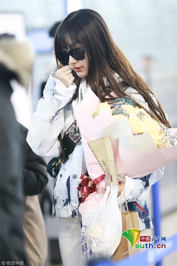 2019年2月24日,上海,楊穎現(xiàn)身機(jī)場(chǎng)。她全白套裝現(xiàn)身身材十分纖細(xì),手捧粉絲送的花與小粉絲合影,十分親切。