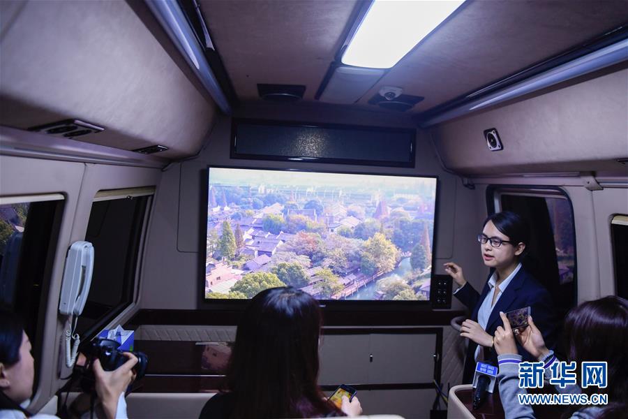 在浙江移動(dòng)烏鎮(zhèn)分水墩營(yíng)業(yè)廳外,工作人員在一輛體驗(yàn)巴士?jī)?nèi)介紹通過(guò)5G移動(dòng)傳輸技術(shù)實(shí)現(xiàn)的8K高清的視頻畫面實(shí)時(shí)展示(10月30日攝)。  新華社記者黃宗治攝