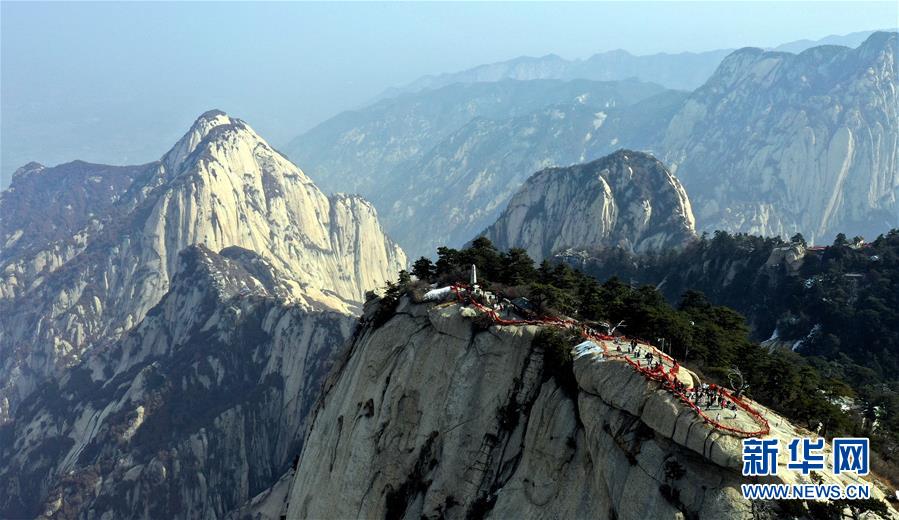3月9日,游人在華山西峰游覽(無人機拍攝)。 隨著氣溫回升,陜西著名風景區(qū)華山進入旅游旺季。 新華社記者 陶明 攝