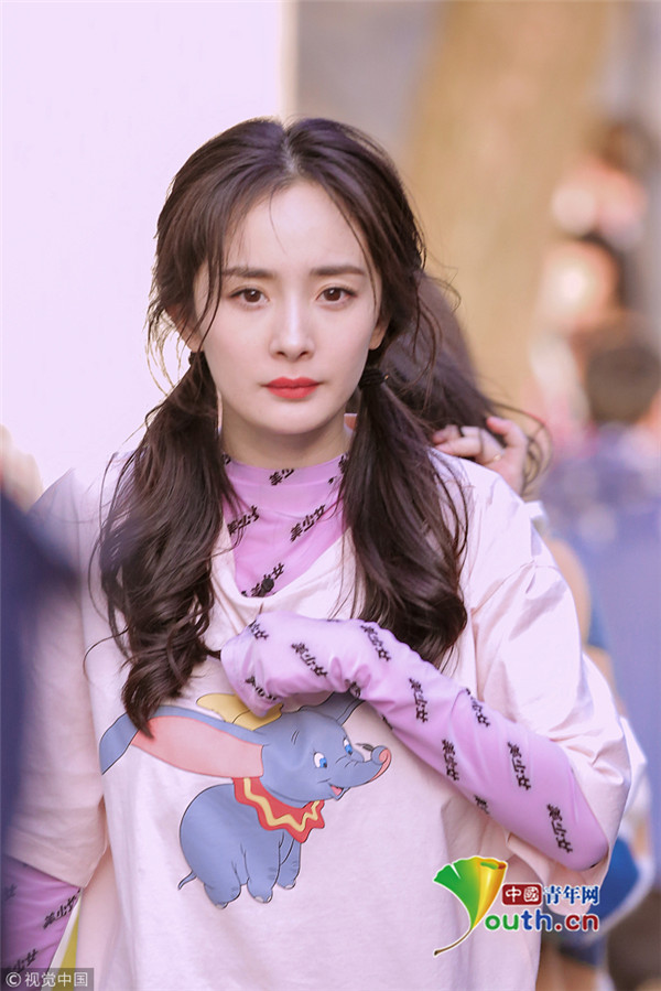 楊冪穿粉衣扎雙馬尾甜美可愛 身材纖細(xì)元氣滿滿