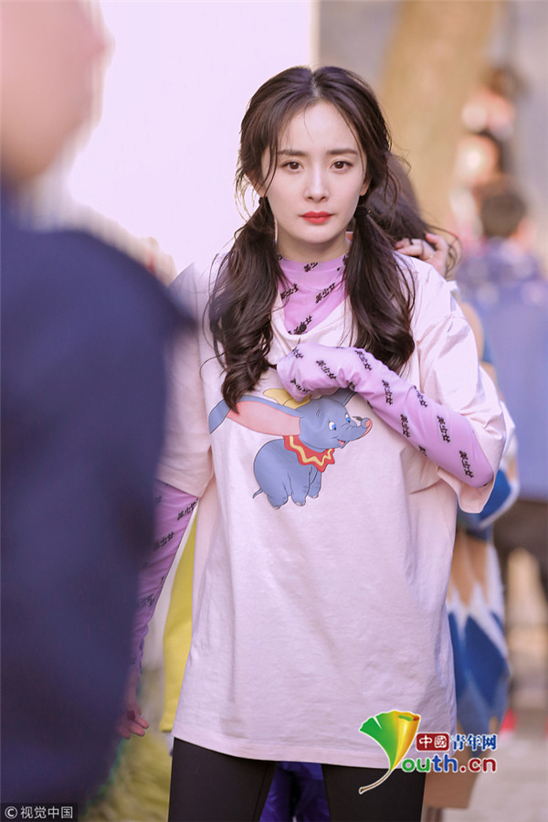 楊冪穿粉衣扎雙馬尾甜美可愛 身材纖細(xì)元氣滿滿