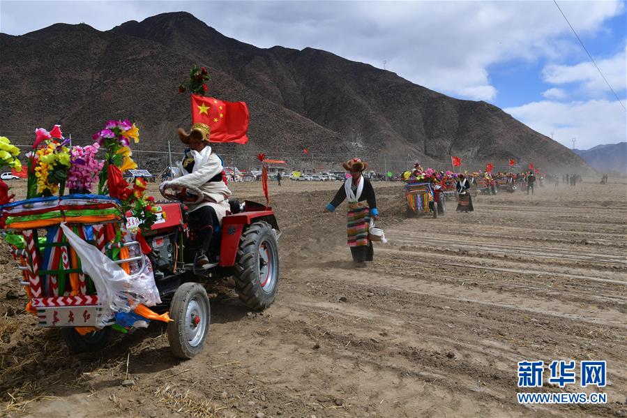 3月16日,山南市乃東區(qū)克松社區(qū)居民在開耕儀式上。 當(dāng)日,西藏各地男女老幼身著節(jié)日盛裝,駕著一輛輛由彩旗、花朵裝扮一新的拖拉機(jī),涌向待墾的農(nóng)田,載歌載舞迎來一年一度的開耕儀式。 新華社記者 晉美多吉 攝