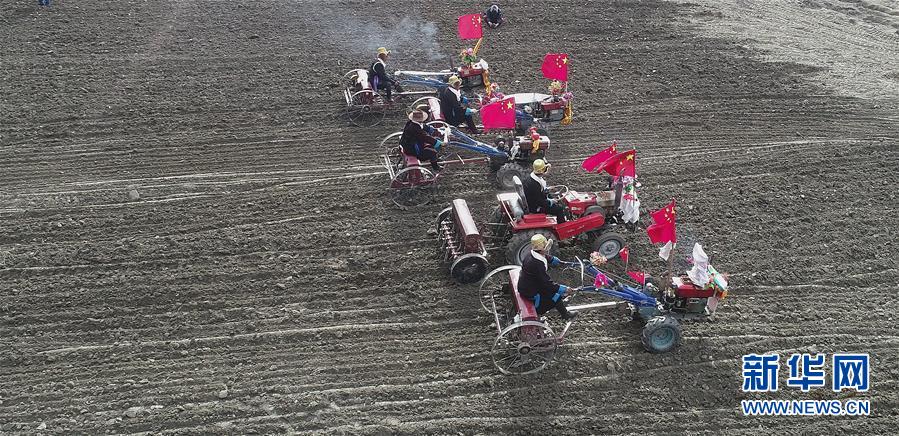 3月16日無人機(jī)拍攝的山南市乃東區(qū)克松社區(qū)開耕儀式現(xiàn)場。當(dāng)日,西藏各地男女老幼身著節(jié)日盛裝,駕著一輛輛由彩旗、花朵裝扮一新的拖拉機(jī),涌向待墾的農(nóng)田,載歌載舞迎來一年一度的開耕儀式。新華社記者 晉美多吉 攝