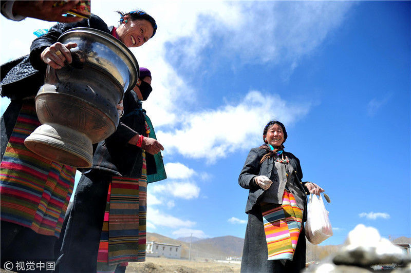 2019年3月16日,西藏各地迎來開耕節(jié)。位于年楚河畔的日喀則白朗縣被譽(yù)為“后藏糧倉”,當(dāng)日,當(dāng)?shù)夭刈遛r(nóng)牧民將家里的耕牛裝扮一新,對(duì)農(nóng)田進(jìn)行開耕,大家齊聚青稞地,慶祝春播開始。圖為白朗縣洛江鎮(zhèn)民眾在青稞地里煨桑煙(一種祈福方式)、敬獻(xiàn)青稞酒,祈福新的一年風(fēng)調(diào)雨順、五谷豐登。 江飛波(西藏分社)/中新社/視覺中國 編輯/陳進(jìn)